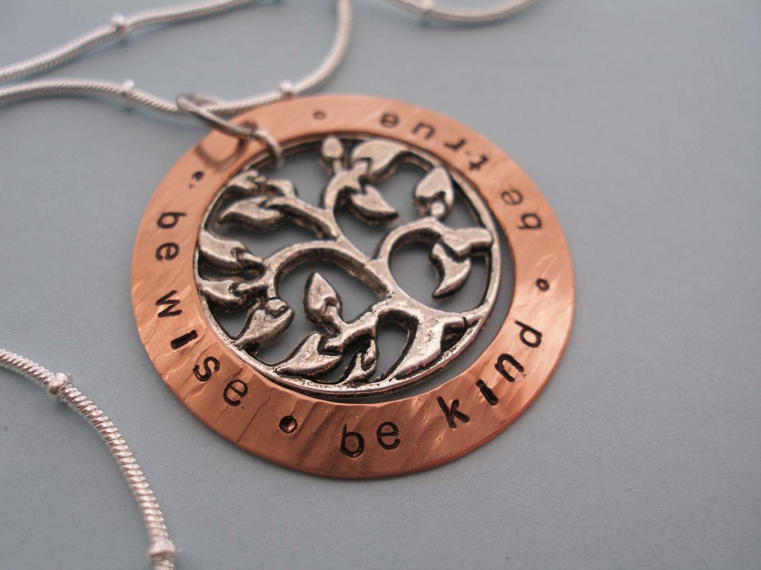 This hand-stamped copper pendant will measure 1 1/4" in diameter.