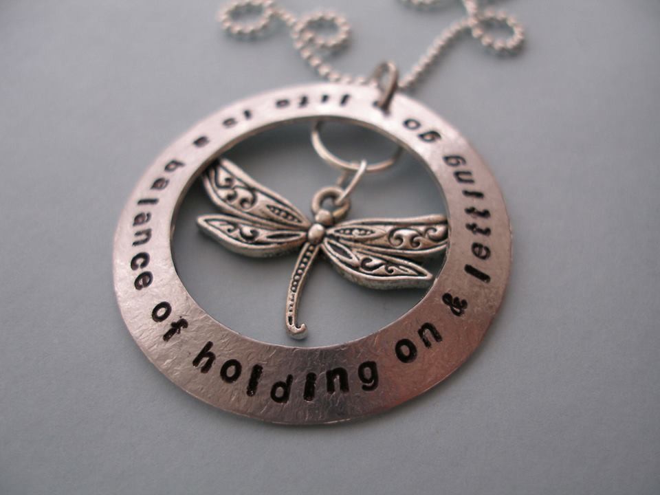This dragonfly & silver/aluminum stamped pendant will measure 1 1/2" in diameter.